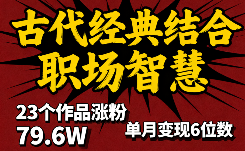 主要是AI视频玩法,用古代经典与现代职场智慧相结合,借古喻今,将古人的为人处世的智慧结晶,通过言简意赅的文案,娓娓道来。一个多月的时间,仅仅发布了23条作品,就获得了79.6W的粉丝和1148.9W点赞,变现收