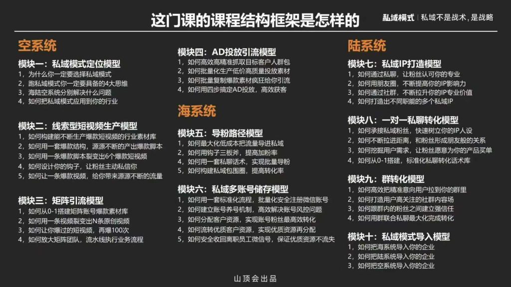 门新课程,新课程介绍看图片或者朋友圈微信群的公众号文章比较详细,私域模式线下大课有海陆空三大系统和十大模型,另外还准备了18个落地工具表,学完即可用,不要自己摸索,直接拿别人的经验抄作业即可,跟有结果