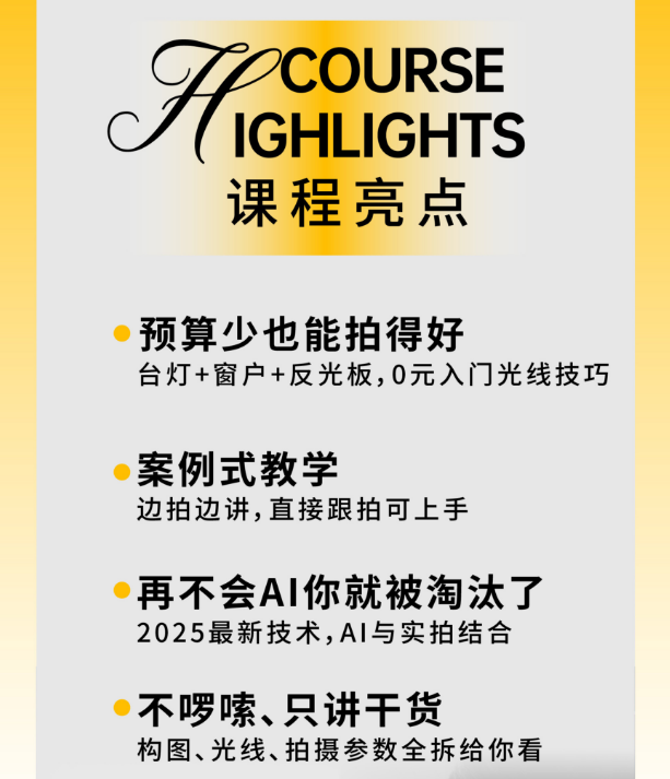 还在为“漂亮饭”拍不出好看图、生活照没氛围、副业摄影缺技能发愁?这门课教你用手机搞定美食/生活/产品摄影:从构图到布光,不用贵设备,AI辅助出片。学前杂乱平淡的照片,学后秒变高级氛围图,朋友圈、探店自