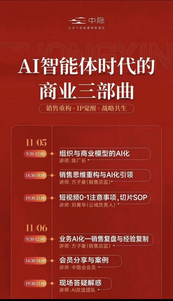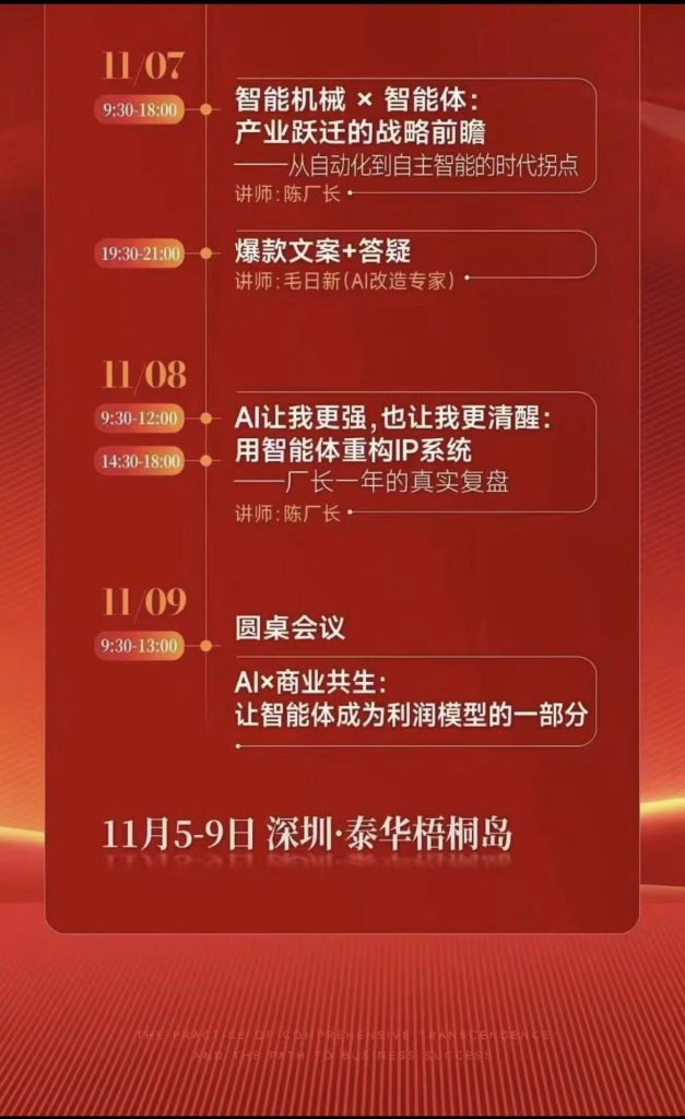 11月5日到9日,整整5天内的容,不单单工是具层面的A1,而是杂复组织 AI化的人教你把已公做司到“完全 AI 化”,做 AI改和造智体能搭