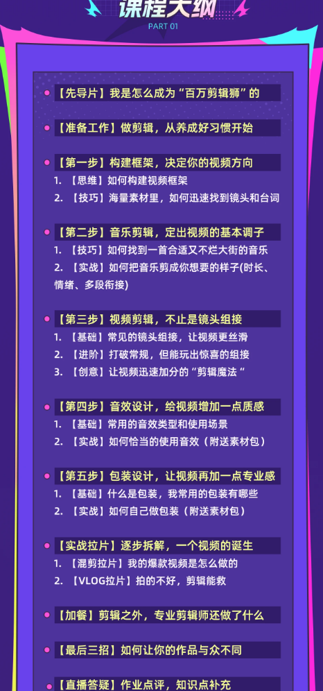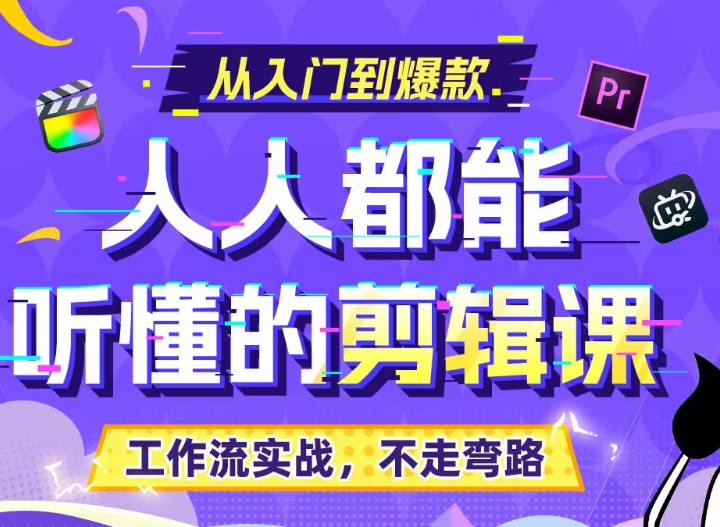 老师傅亲传,以剪辑工作流为课程主线,让你最清晰的了解,每一步该怎么做的,每一个问题该怎么解,让你学会如何让作品脱颖而出。不讲理论,主打实用;不局限于软件,小白也能轻松上手;让你潜移默化地掌握高手的